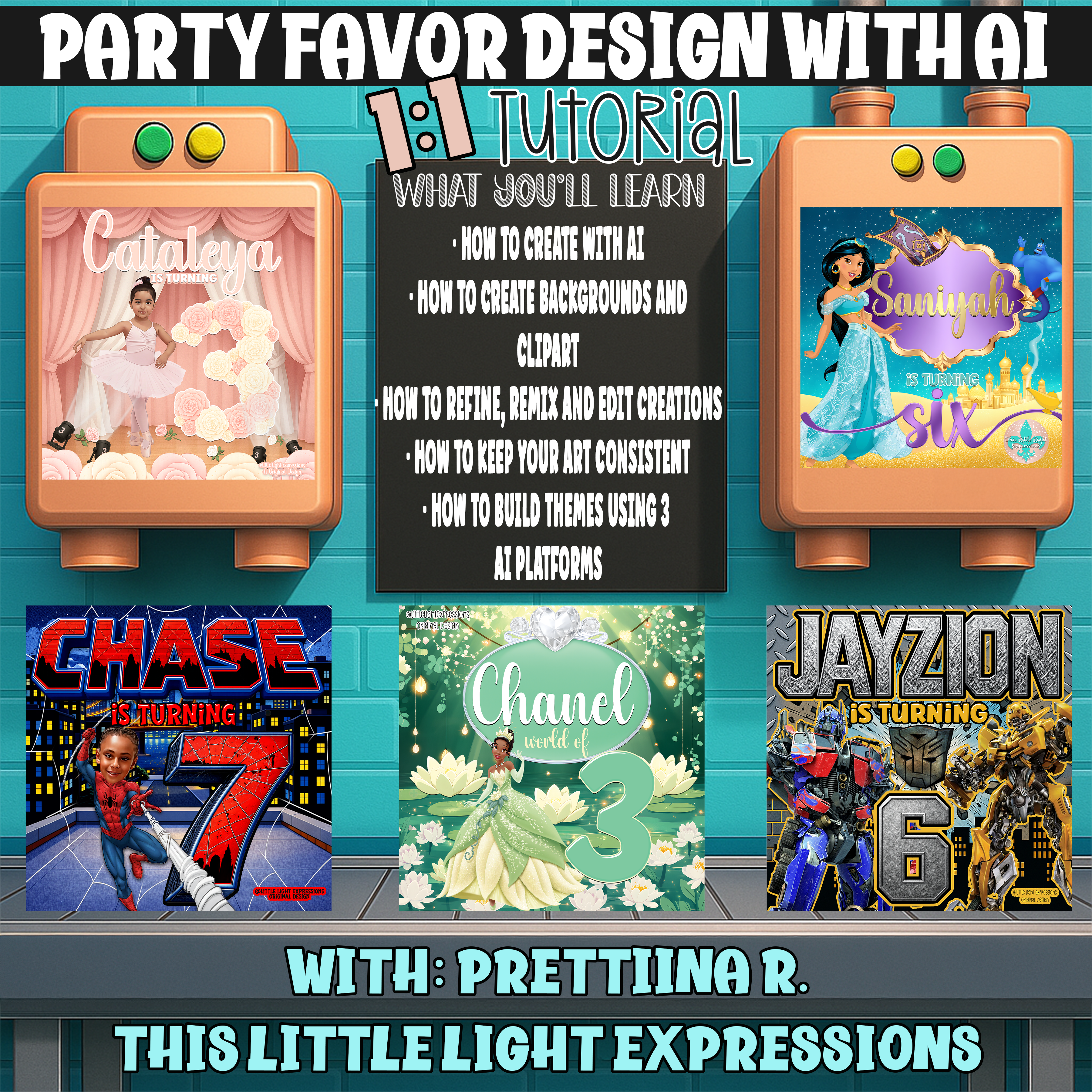 This is not a recorded course . It’s private, focused coaching so you leave knowing exactly how to create, edit, and build party favor themes with AI.